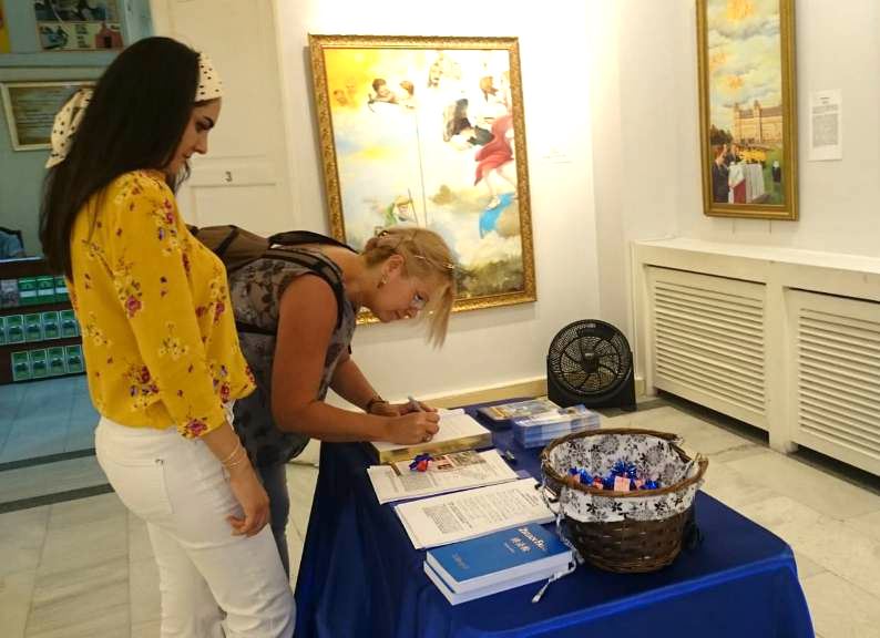 参观者Ufuk Yüksel表示,原来不了解中共,今天看了美展,让他感到震惊。他和太太在要求停止迫害的请愿信上签了字。
