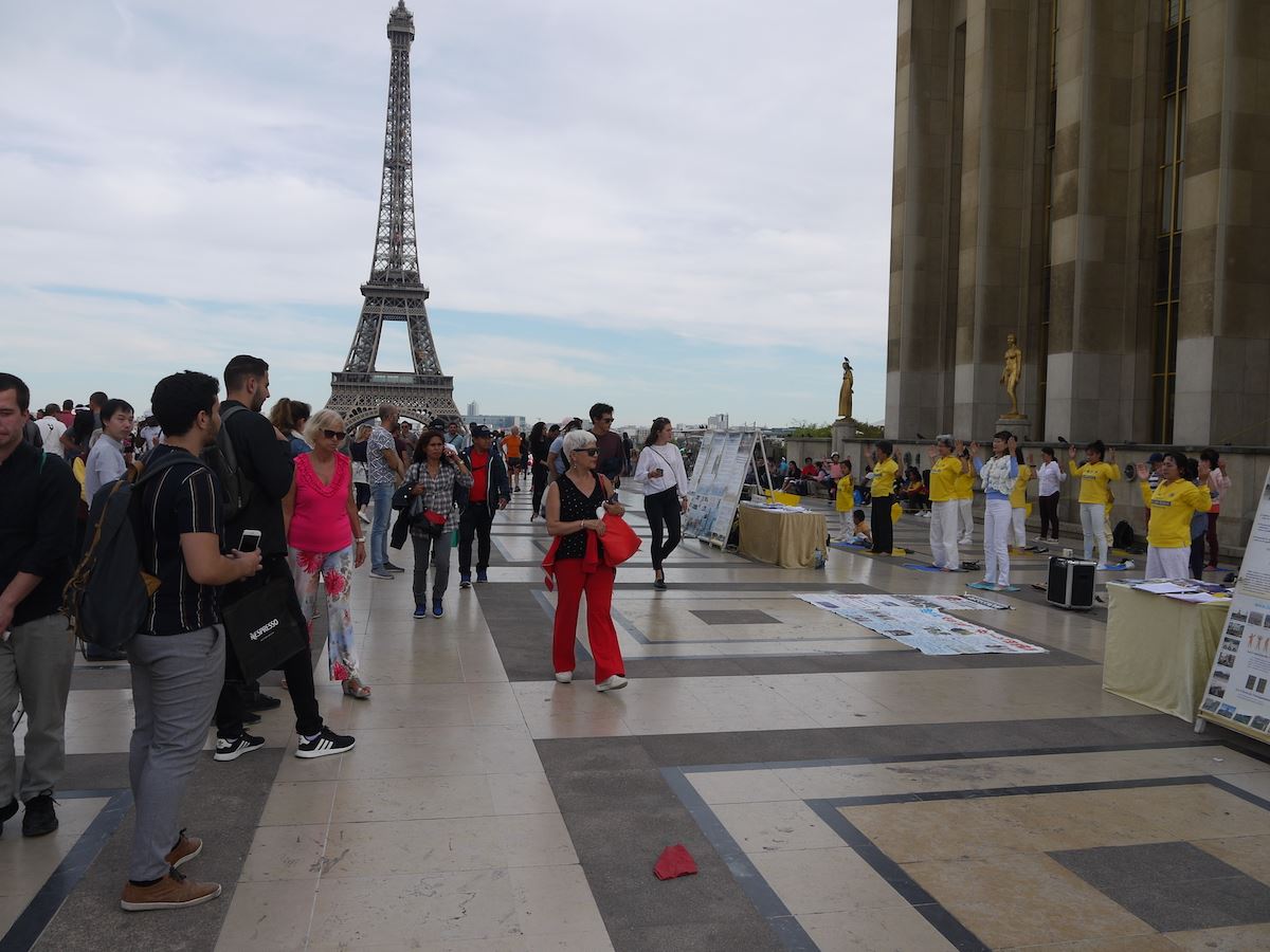 【明慧网二零一八年十月十六日】(明慧记者德龙、周文英法国报道)十月的巴黎秋高气爽,埃菲尔铁塔附近的游客仍是“人山人海”。十月十四日, 巴黎部份法轮功学员如期来到铁塔旁的人权广场。通过横幅和展板向人们揭露在中国遭受迫害的真相。同时,在现场炼五套功法,向游客展示法轮大法的美好。