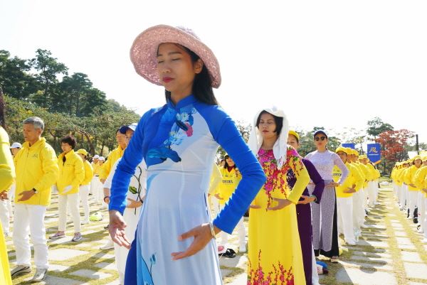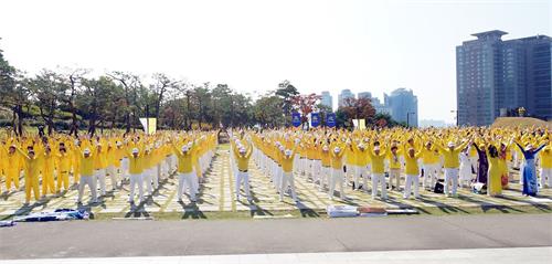 ![]() 图1~2:参加亚洲法会的法轮功学员们在首尔白凡公园广场集体炼功。 |