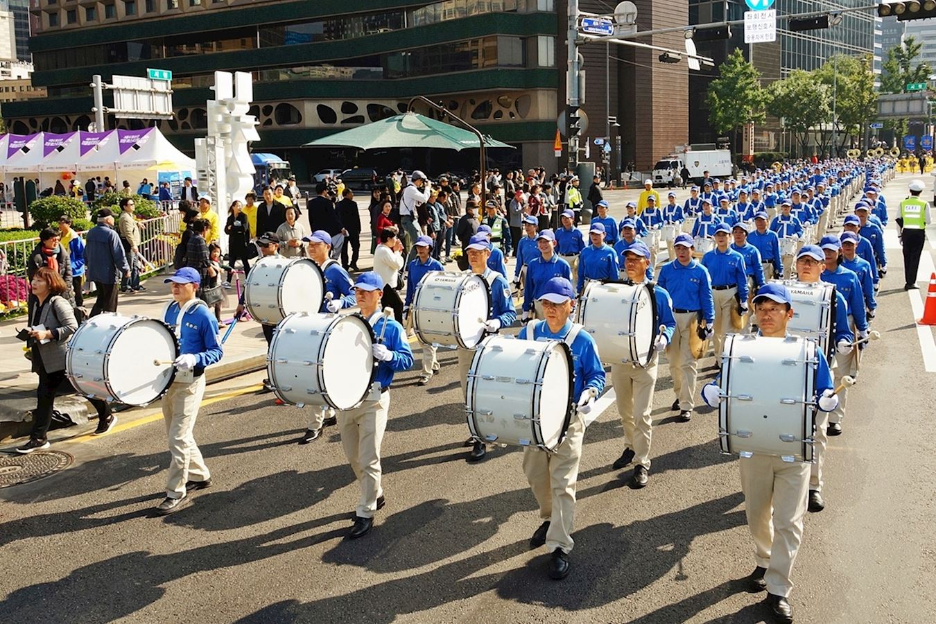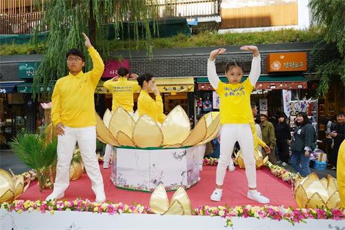 ![]() 图3:天国乐团演奏了“法轮大法好”、“神圣的歌”等乐曲,美好的旋律飘荡在首尔的上空,市民们纷纷驻足观看。 |
