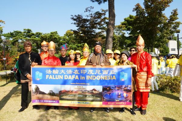 印度尼西亚法轮大法学会会长卡多先生身着传统服饰参加了游行,卡多先生是第一次来韩国。“在韩国见到了许多其他国家的学员,就象与老朋友重逢一般,非常愉快、非常高兴”,他说,“亲自来看一下、学一下就知道法轮大法有多好了,希望更多的韩国人通过这次活动了解法轮大法的美好”。