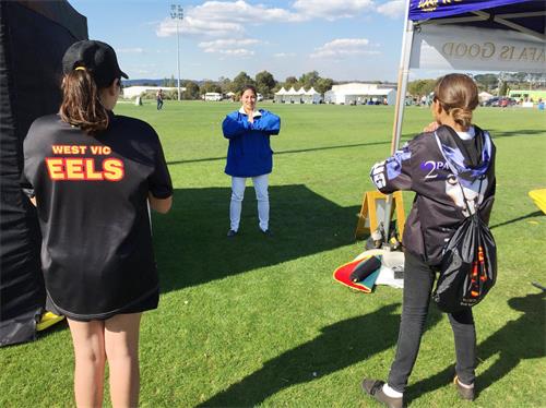 活动主办方的工作人员、维州社区健康服务机构的社工洛弗尔(Naomi Lovell)女士,被法轮功学员的功法展示深深吸引,主动前来了解详情。
