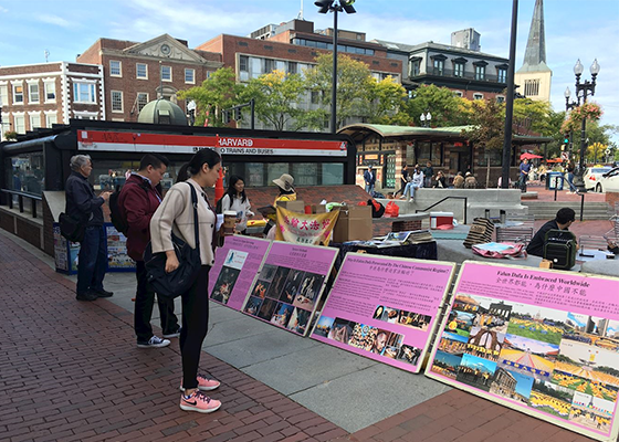 - 哈佛广场传真相小故事(图)- 九月三十日,法轮功学员们再次在哈佛中心广场摆展板、举横幅、发资料、征签,给民众讲真相,引起许多中外人士对迫害和活摘的关注。