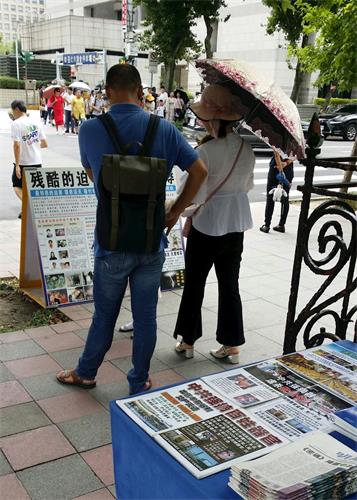 有位资深导游主动关心学员:“你们法轮功,不管天气如何或放不放假都在这里,就为了给大陆游客资料讯息,真让人感到温暖!所以我都跟团员说:‘天下事,哪能不知道?法轮功发这些报纸资料,可能就有你该知道的国际大事,而且都是免费的,有什么不能看的呢?’”