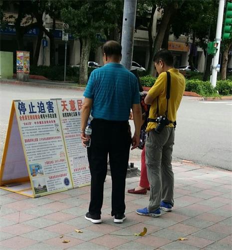 来自河南的退休老先生在经过法轮功真相点时,主动向学员要资料:“来台湾就是想看共产党不让看的。”学员提供了《九评共产党》及各种真相材料、并为他取了化名三退(退出中共党团队)。