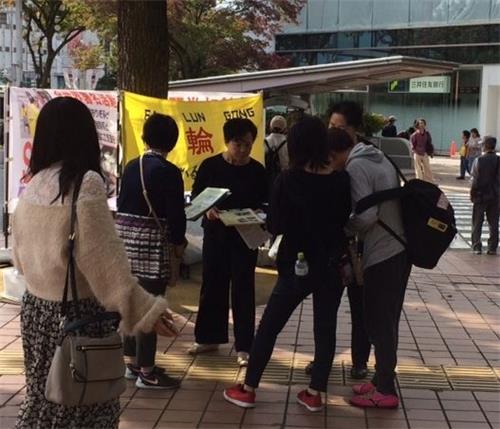 下午,有四位从中国大陆来日本旅游的年轻人路过,他们看起来大概二十四、五岁的样子。法轮功学员给他们讲了法轮功弘传世界一百多个国家和地区,只有中国大陆在迫害法轮功的情况。他们都拿了真相资料,表示回去会看。看到一个又一个穿着古代服饰的方阵走过,他们问法轮功学员这些人们在干什么。学员告诉他们,这是参加名古屋市庆祝活动的人们,因为在日本的历史上,织田信长(Nobunaga Oda)、丰臣秀吉(HideyoshiToyotomi)、德川家康(Ieyasu Tokugawa)这三位名人都出生在中部地区,所以名古屋市每年都举办纪念他们的大型游行活动。四位年轻人又向法轮功学员询问了名古屋都有什么好玩儿的地方,法轮功学员给他们提供了详细信息,并祝他们路途愉快,他们临走时向法轮功学员表示感谢。