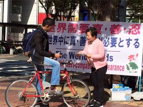第一天下午,有一位看起来五、六十岁的先生,跟法轮功学员聊了很长时间。他说:我们都知道法轮功在中国受迫害,包括被活摘器官,这场迫害应该立即停止。他还说,为什么日本的媒体对这场迫害不发声呢?都是因为日本经济界的原因。经济界的人们只看重中国的巨大市场,想赚钱,让中国人买日本的东西,根本没有一点儿人权意识,实在太可悲了。他临走时,主动跟法轮功学员要了一些法轮功的真相小册子,他说要拿给他周围认识的人。