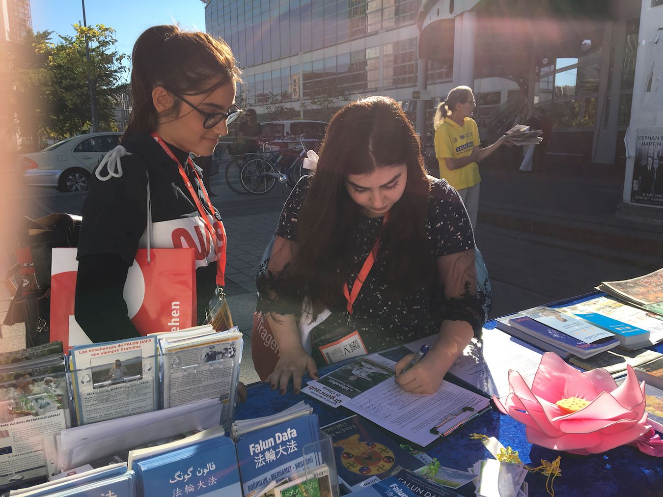 德国女士嘉诗卡·福黑根(Jessica Fregin)是位残障人士,她和一年轻女士从法轮功展位前路过时,越南籍法轮功学员Ly递给她们真相传单。福黑根女士接过传单后,认真地听Ly介绍法轮功。