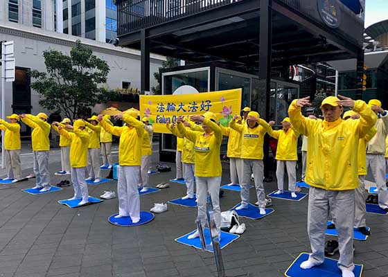 二零一八年十月二十七日星期六,新西兰奥克兰法轮功学员们来到市中心的天空城集体炼功、讲真相。