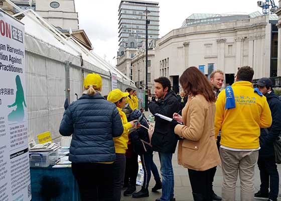 十月二十七日,部分伦敦法轮功学员在特拉法加广场(又称鸽子广场)北平台举办炼功、讲真相、征签反迫害活动。