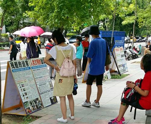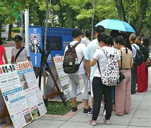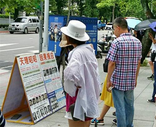 有位导游在经过真相点向团员介绍:“你们看一下,在台北各个景点都看得到的台湾特产、叫做‘真相展板’!这是法轮功学员送给你们的礼物,请你们多多享用。好,现在进去参观完交接典礼,然后我们就回到真相展板前集合。”