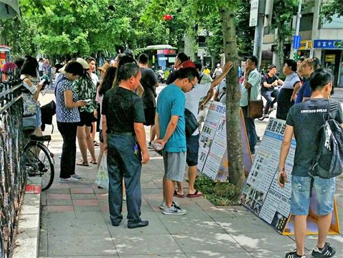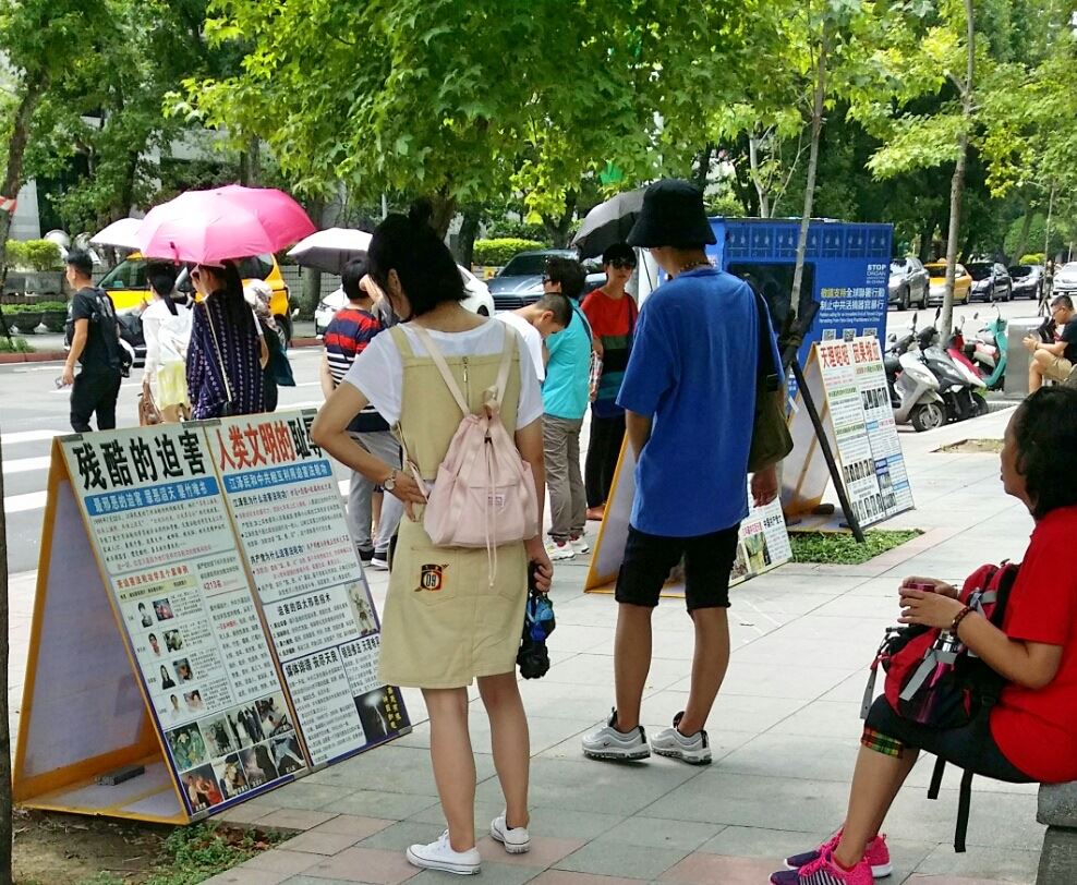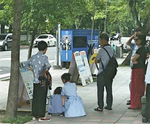 不久来了一对来自福建的年轻夫妻问路,先生忽然指着展板说:“这些内容我都翻墙看过了,我们同学都在翻墙传阅,所以我们都不相信共产党。对了,我看过那本书《九评共产党》,里边说的共产党九大邪恶基因,真的很对很有道理……在中国没人喜欢江泽民的,他干了大坏事一定会遭报的!”但这位先生不了解三退的意义,学员引导他阅读了相关真相展板后,为他做了三退;在一旁的太太喃喃自语:“看来我也应该多看看、多了解这些讯息,请多给我一些书跟资料。”学员为这位太太准备了资料,也帮她做了三退。