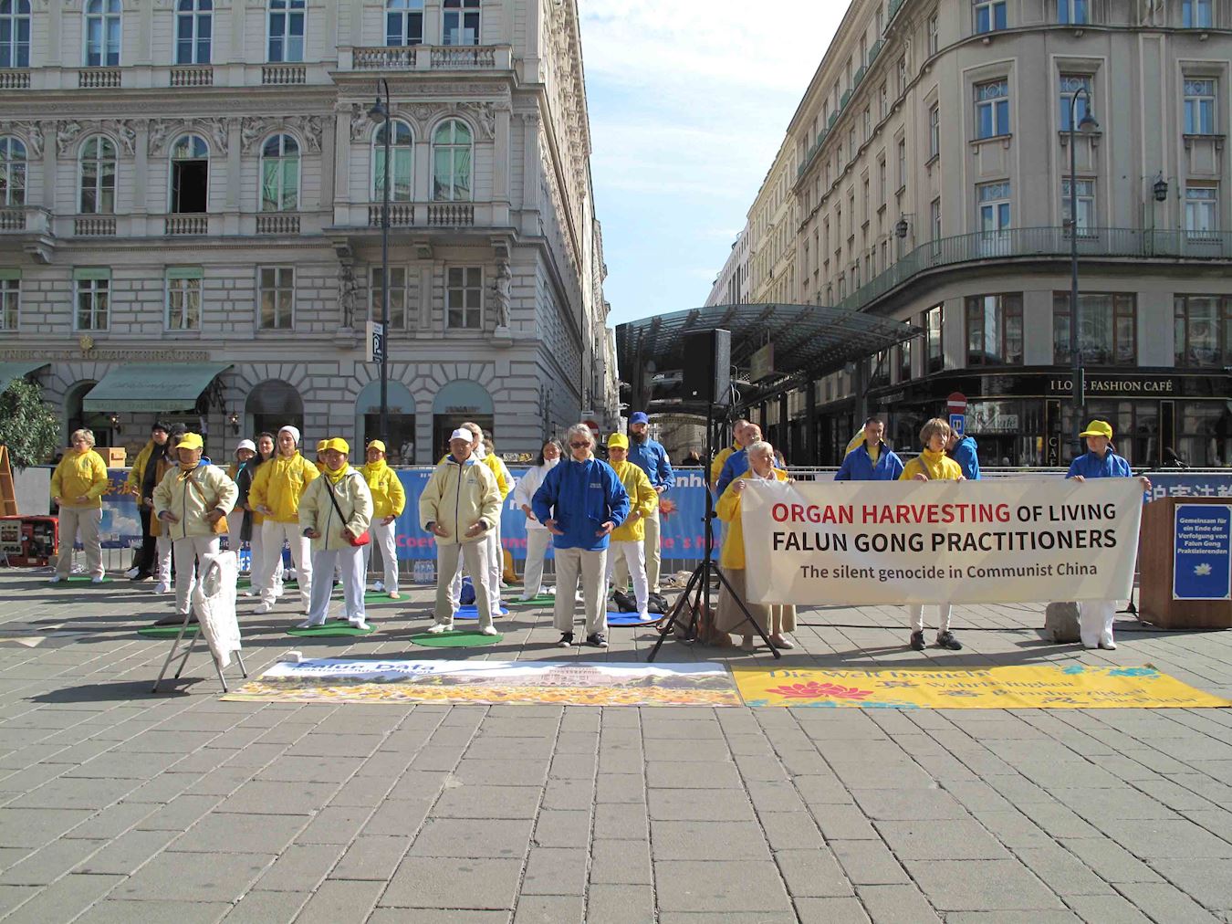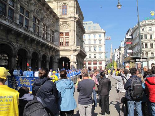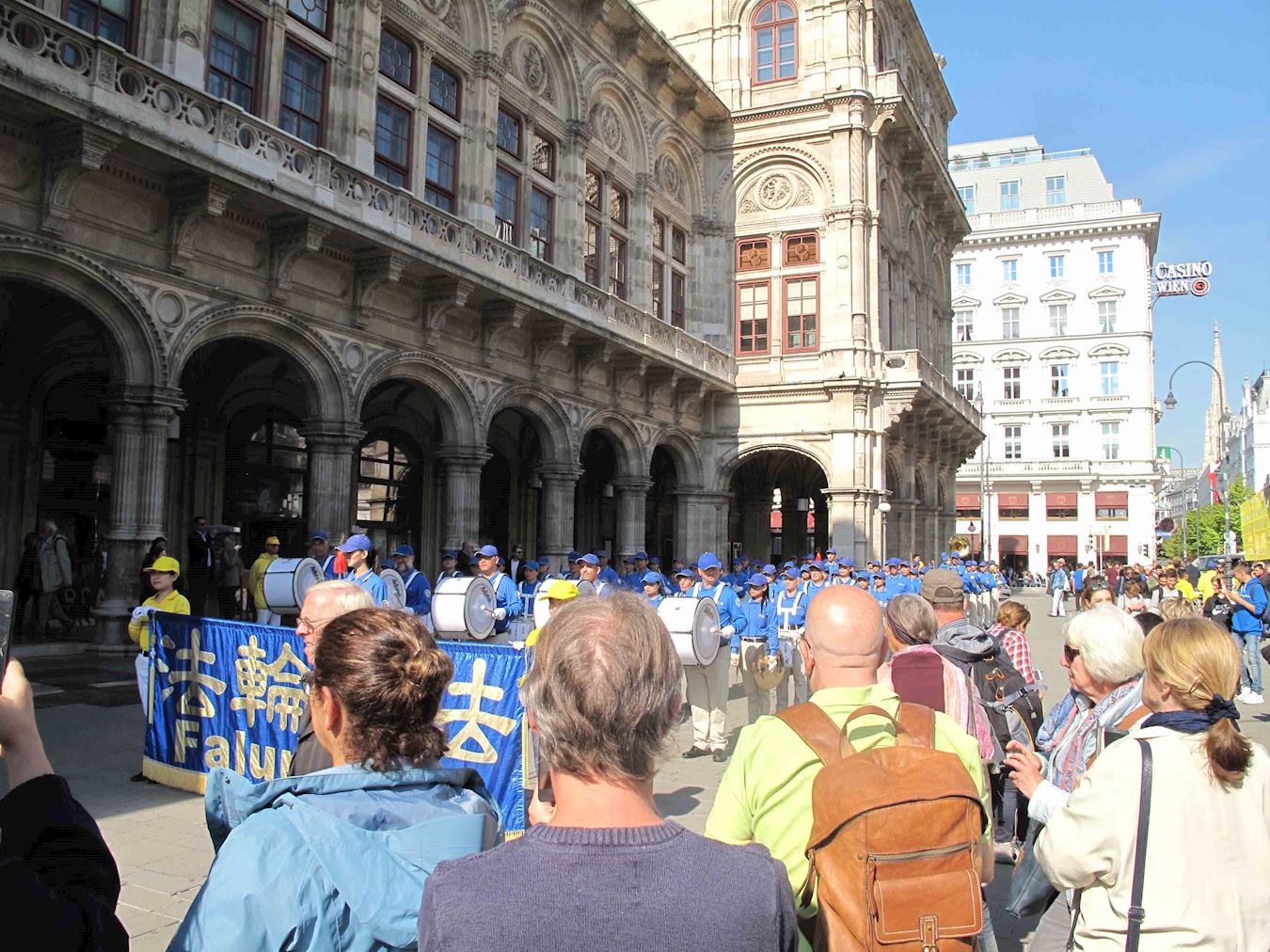 集会过后,法轮功学员的队伍由天国乐团开道,穿过这座世界音乐之都。他们经过霍夫堡王宫、艺术史博物馆、最重要的政府机构以及游客最多的购物街。游行过程中,活动主持人弗洛里安(Florian)站在模拟活摘罪行的车后面一路拿着麦克向沿路民众用英德双语讲述真相,一方面告诉人们法轮功教人真善忍,是修炼,另一方面揭露中共的残酷迫害。