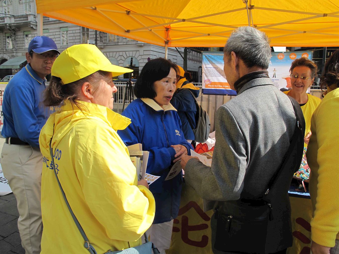 一位维也纳的华人学员向他介绍了什么是法轮功,以及两天前有一千多名法轮功聚集布拉格举办大型活动。他很吃惊表示要去找当地炼功点。当学员和他说到天灭中共三退保平安的时候,他说他看过《九评共产党》,很清楚中共的邪恶本质。