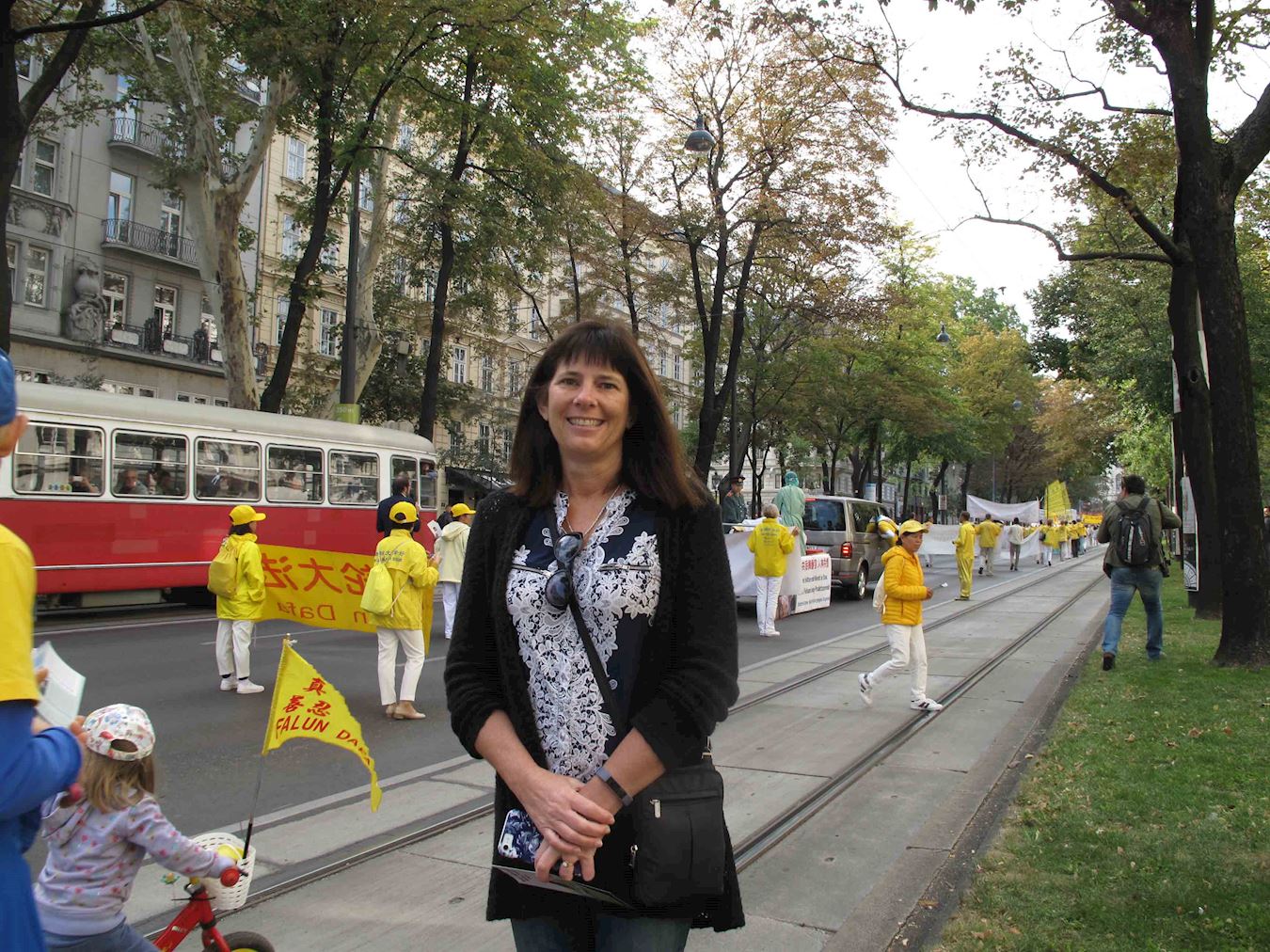 游行开始前她向明慧记者表示:“在和他们(法轮功学员的接触中),我感到他们非常积极正面,非常友善。我也感到到这里来公开正式地表达我对他们的支持非常重要。”作为国际事务委员会成员之一,亨格兰德女士表示:“奥地利在和中国外交事务中,需要不时提及人权问题。在外交部人权部份占有很大的席位。在制止法轮功学员被迫害一事上,我们一直在做很大努力。”