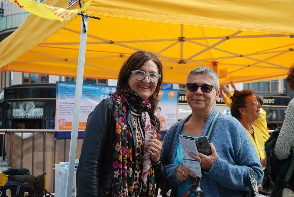 图16:舒伯特女士(右)和戛沙女士(左)在反对活摘的征签表上签字,为“制止迫害尽力”。