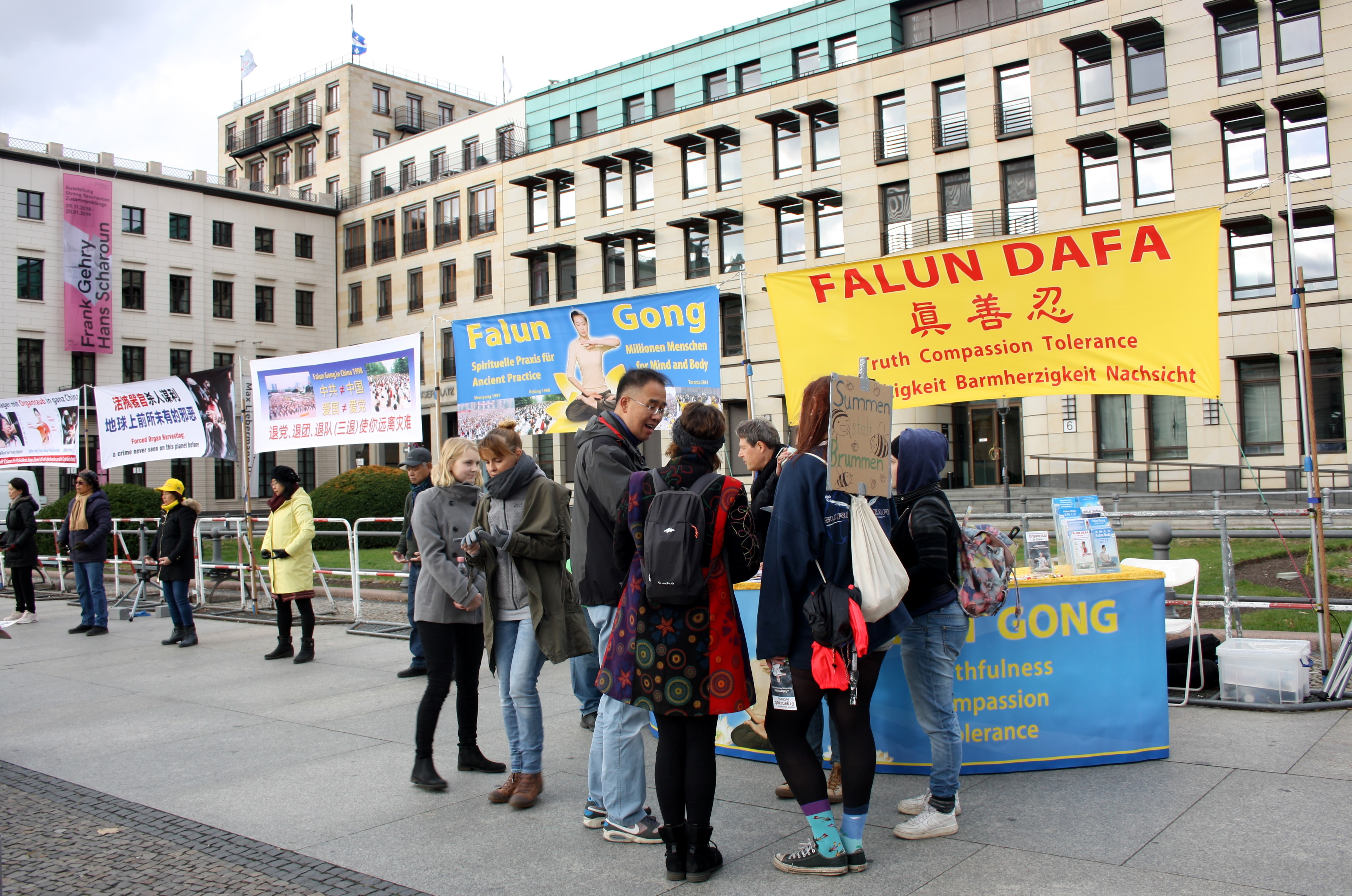 来自伦敦的Samy也来声援中国的法轮功学员,他用英语问,“我在哪里可以签名?”他曾在伦敦的唐人街看过反活摘的信息展位。“我看到人们经过那个展位,也有人停下来阅读横幅,想要了解更多关于世界另一端发生的事情。”在柏林看到展位后提醒了他,便立刻走过来找法轮功学员。