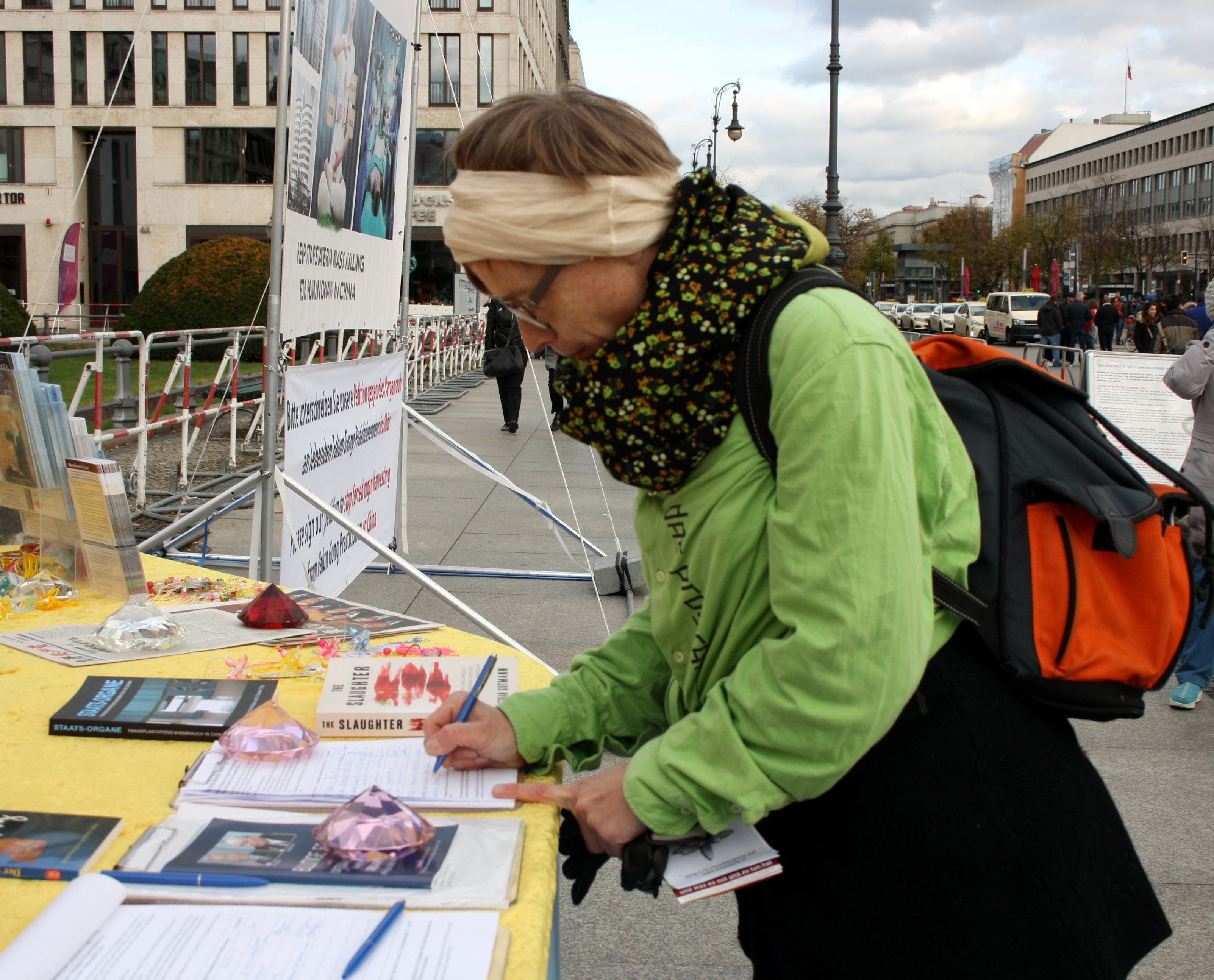 嘉布里埃尔(Gabriele)一到展位就签署了请愿书。她强调:“这场迫害违背了人类的尊严”。在美国度假期间,她在一个信息展位了解到中共强摘器官的罪行。 “这些人(法轮功学员)在中国完全是和平的,不应该受到中共的迫害。”她说。她希望引起德国政界对这场迫害的关注,并“通过经贸关系向中共施加压力”。