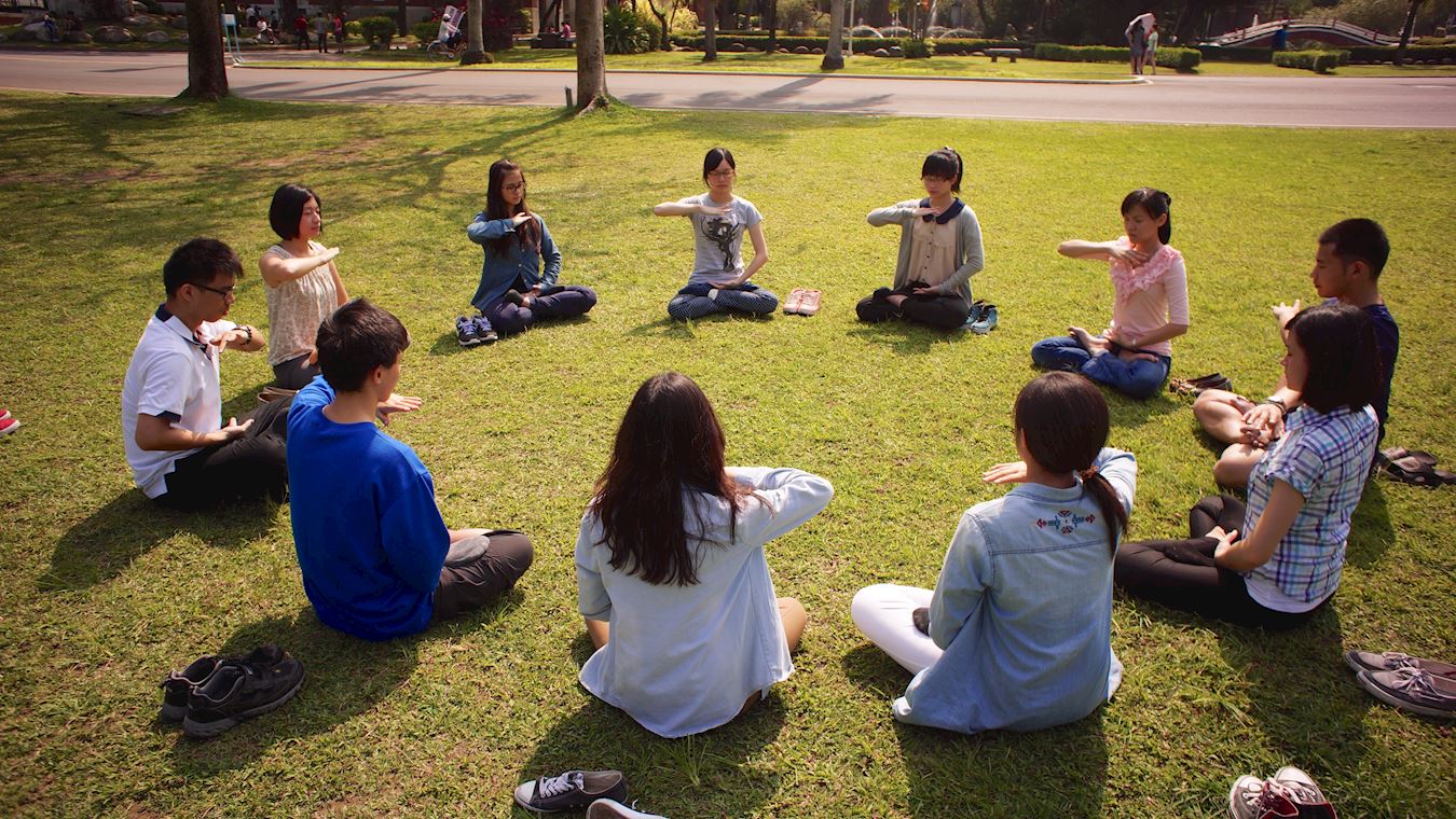 图2:德仪(上排中)和青年同修们打坐炼功。