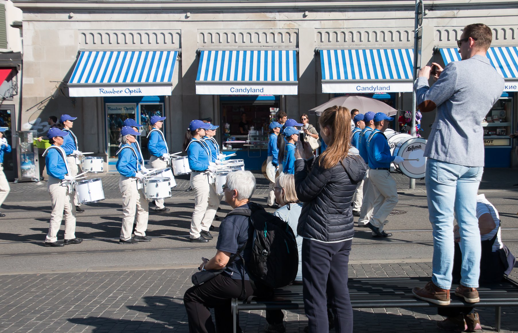 法轮功的游行队伍从苏黎世的海尔维广场(Helvetiaplatz)出发,穿过苏黎世市中心,沿着利马特河畔到达布克利广场(Bürkliplatz)的市政府公园(Stadthausanlage)。有的路人拿出手机记录这一特殊的场景,有的则仔细阅读拿到的传单,想更多了解法轮功。有的则非常惊讶,法轮功学员可以在工作日拿到游行的许可,他们知道在苏黎世得到这样的许可是非常不容易的。