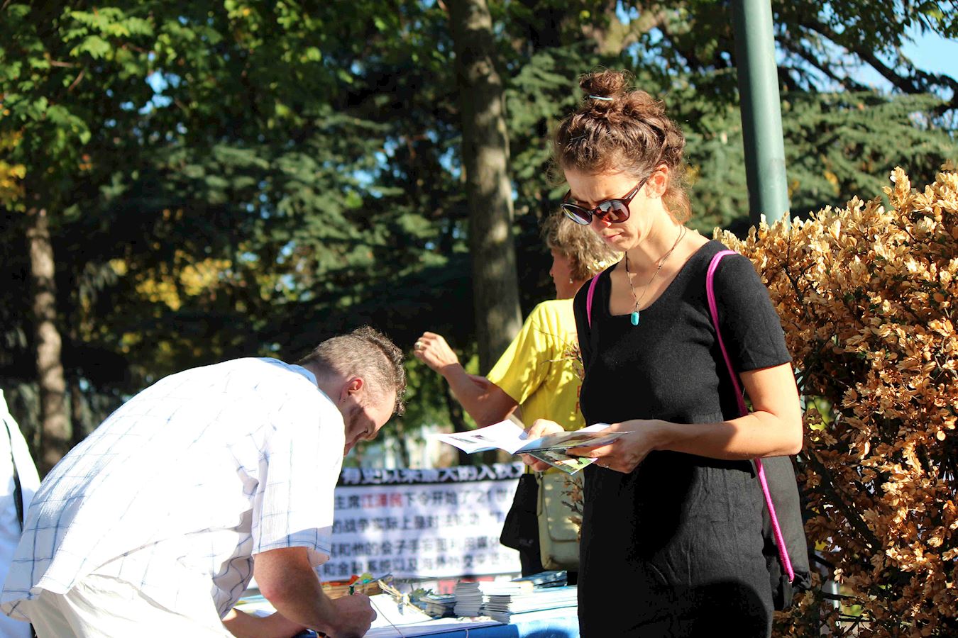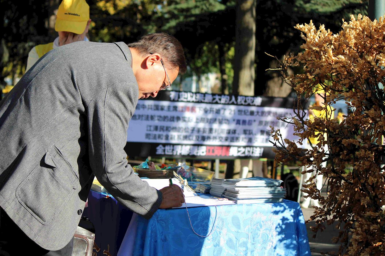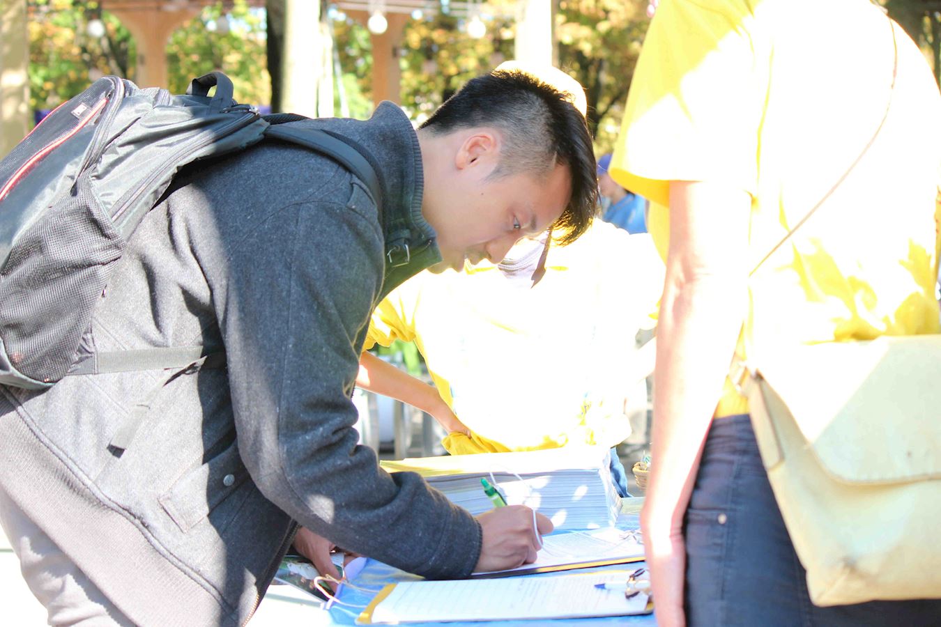 通过学员的介绍,很多路人了解到十九年来中共持续血腥的迫害法轮功学员,酷刑折磨,甚至活摘法轮功学员的器官,牟取暴利,而这仅仅因为他们惧怕法轮功学员有自己的信仰,能够自己判断好坏是非。他们纷纷签名表示自己对法轮功学员的支持。