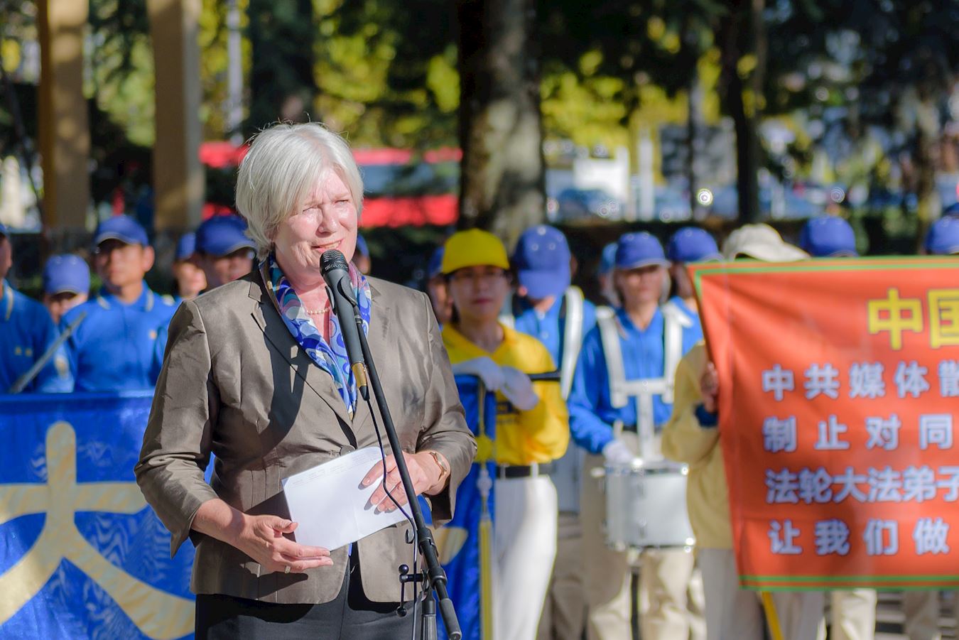 她认为法轮功学员的集会能让更多人关注人权:“这次集会也应该被理解为一个警钟。叫醒所有在我们国家也选择沉默的人们。至少给人的印象是民众和媒体越来越少的在关注人权。”