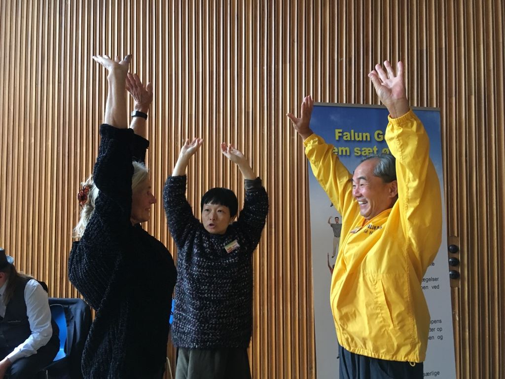 来自格陵兰岛的约库姆什(Jokumsen)夫妇,看着法轮功学员炼功,感觉到非常优美祥和。学员告诉他们,法轮功是一种来自东方的传统修炼方法,按照真善忍指导修炼,能够达到身体健康,道德升华。