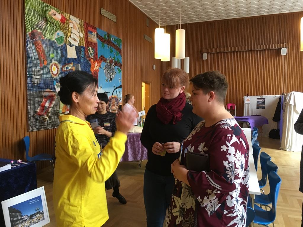 迪特(Ditte)和朋友安妮亚(Anija)一起来看健康博览会,她们边走边看寻找感兴趣的方法。当她们来到法轮功的展位前,感觉到这个展位与众不同。其它的展位大都是被动的接受治疗,而法轮功是主动的炼功。