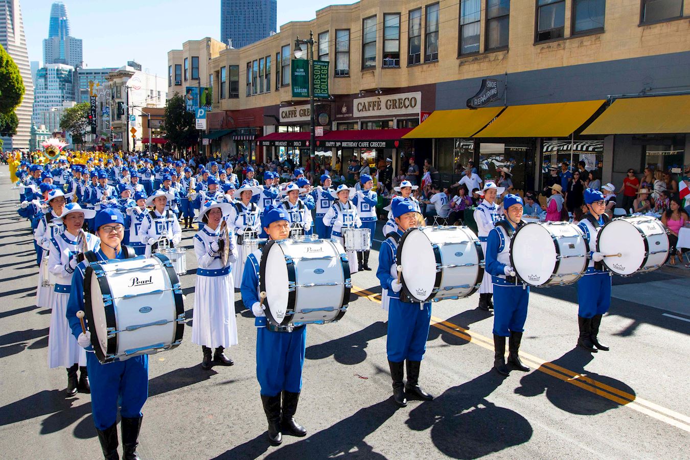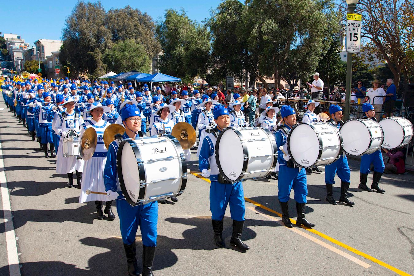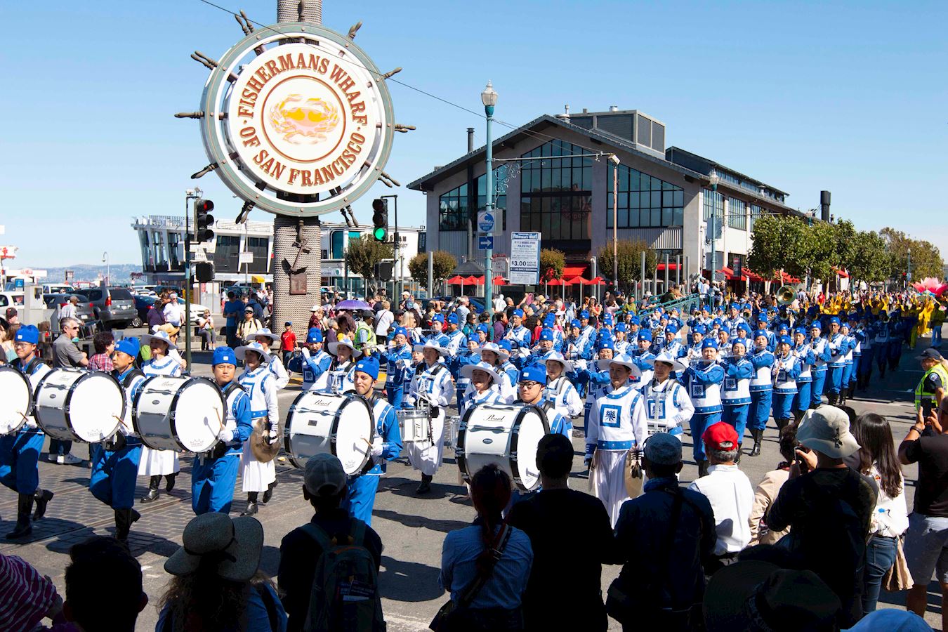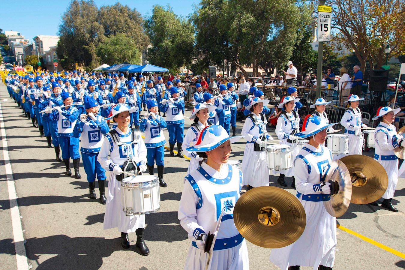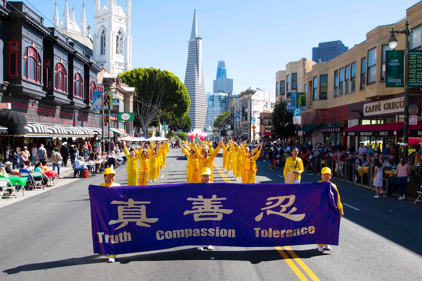 当法轮功的队伍经过主席台时,主持人向观众介绍说:“现在走过来的是法轮大法天国乐团的队伍。天国乐团的成员不仅演奏乐器,而且他们还是法轮大法的修炼者。法轮大法的原则是真、善、忍。年复一年,法轮功的队伍都是最优美的队伍之一。我们真的非常感激他们。让我们为他们鼓掌。”