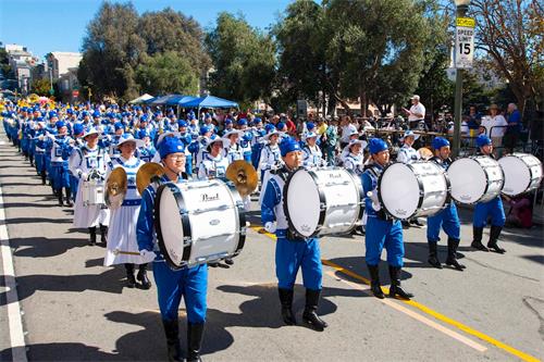今年,法轮功学员的队伍有美西天国乐团、炼功队、花车和腰鼓队,阵容强大。他们所到之处受到观众的喜爱。