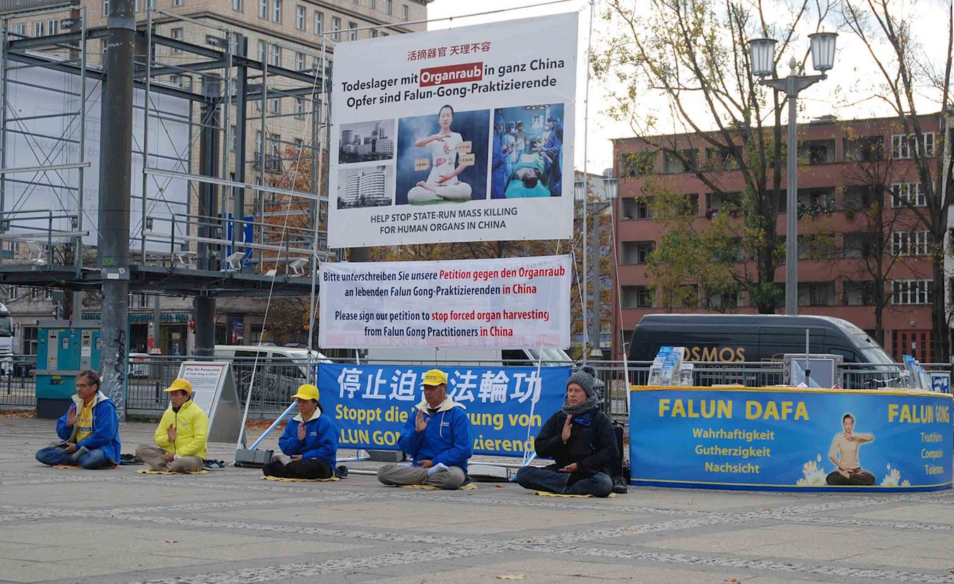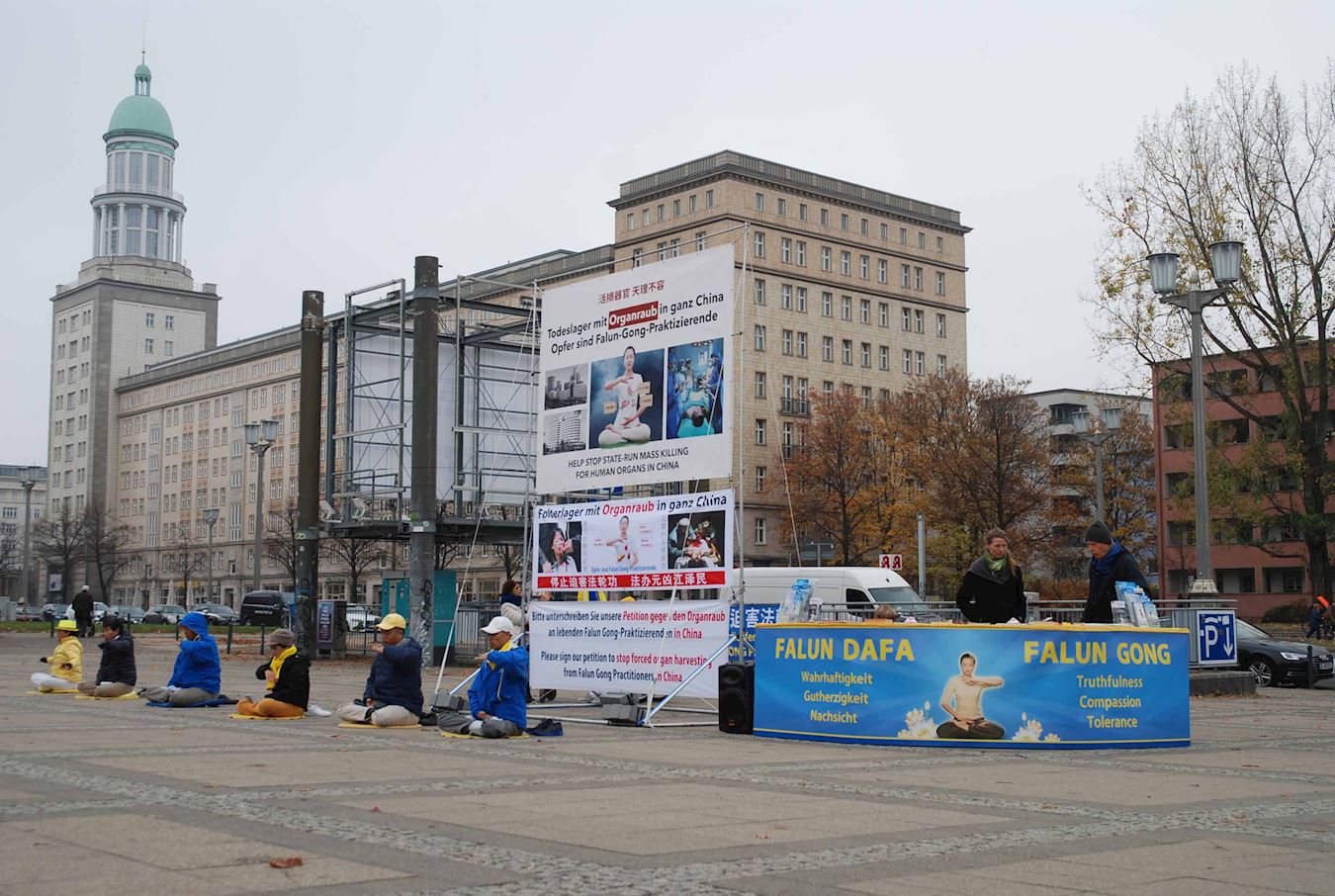 '图1~2:十一月八日和九日,法轮功学员在第二十七届德国器官移植会议期间,在柏林Kosmos多功能会议中心对面举办信息日活动,向德国医学界揭露中共对法轮功学员的活摘器官罪行。'