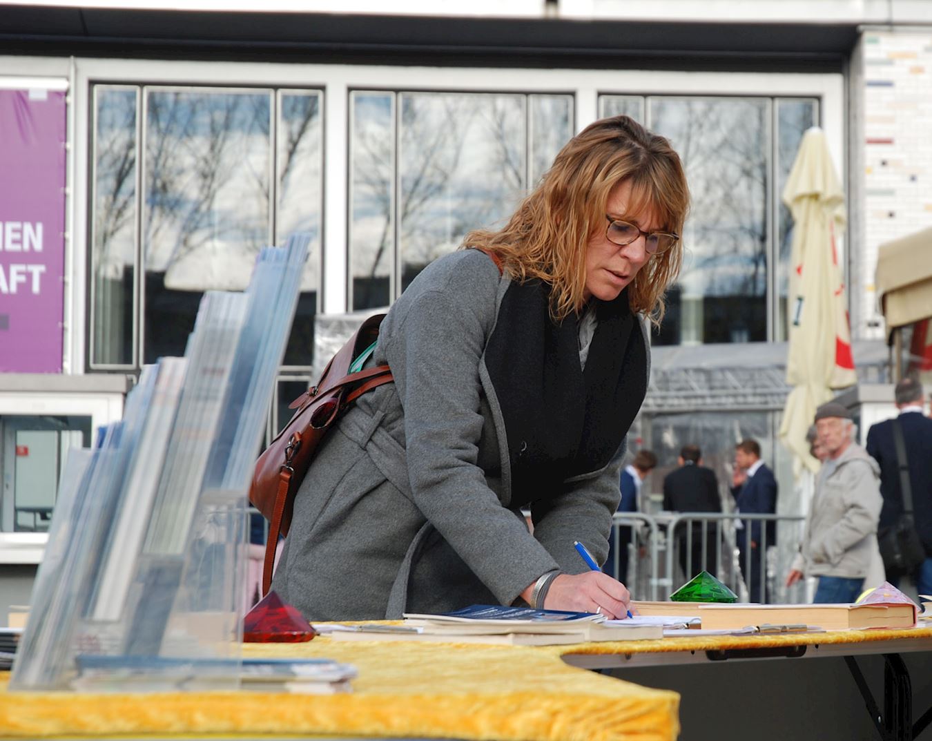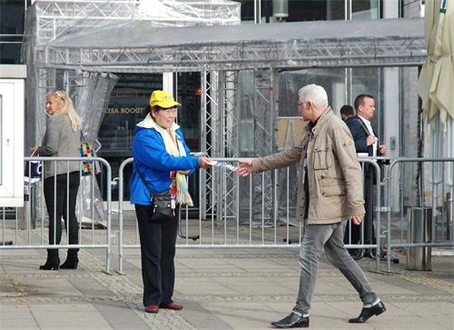 瓦德玛(Waldemer)是位看上去很含蓄很有修养德女士。她午休过后走回公司的时候,路过法轮功学员的展位。她对法轮功不陌生,曾在中使馆前多次见到过法轮功学员在那里抗议,她得到一份真相传单后,上网搜素关于法轮功的信息,仔细了解过。这次她简短跟学员交谈后,马上在征签簿上签了字。