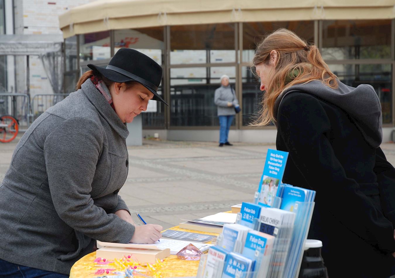阿比盖尔·威尔希曼(Abigail Welchman )女士在去看医生的路上看到学员的大横幅后停下来。阅读征签表的内容后马上签了字,又拿了几份真相材料装进包。她说:“我希望世上所有的人都知道迫害的事情。法轮功学员做得很对,让所有的人都知道,民情上陈,使德国各级议员对此事关注,使德国政府向中共施加压力。我一会儿就把传单给我的医生一份,得让更多的人知道才行”。