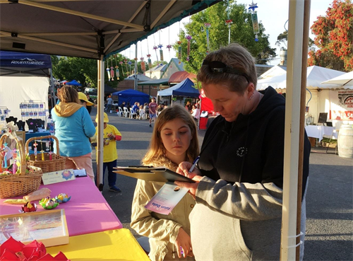 【明慧网二零一八年十一月十三日】(明慧墨尔本记者站报道)二零一八年十一月十日,周六,位于澳大利亚维州中部旅游景区、毗邻马其顿山(Macedon Ranges)的重镇里德尔斯小溪镇(Riddells Creek)举行了一年一度的社区节庆。墨尔本法轮功学员首次参加,在入口处设立的法轮大法展位吸引了大量民众驻足。