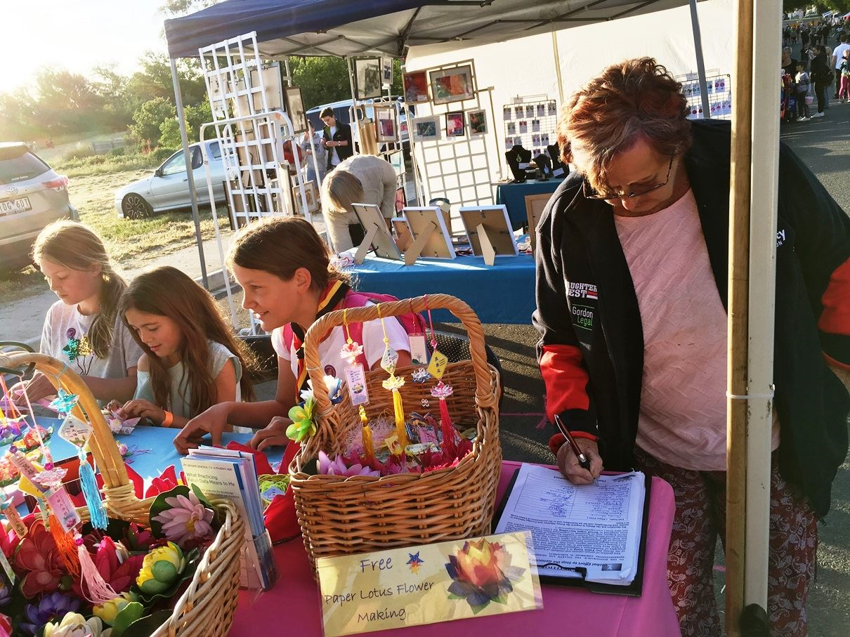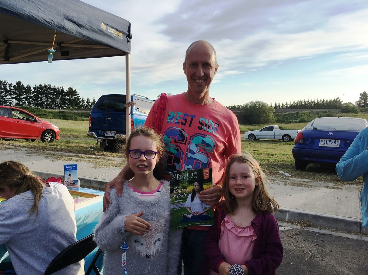 当地居民、在墨尔本市中心工作的IT领域销售经理派伊(Pye)先生,耐心的陪着两个学做纸莲花的女儿,在法轮大法的展位前停留了许久,并在制止迫害的征签表上签了名。