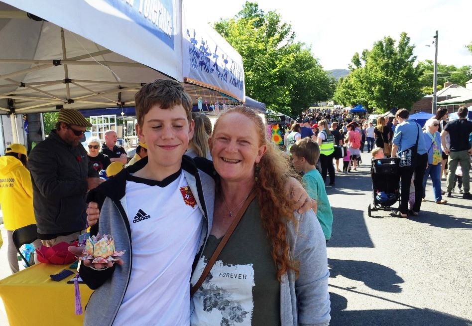 图5:墨尔本居民罗根(Angela Rogan)女士和儿子感受到法轮大法的美好祥和。