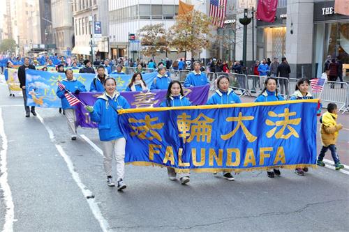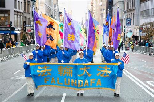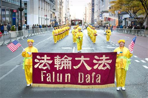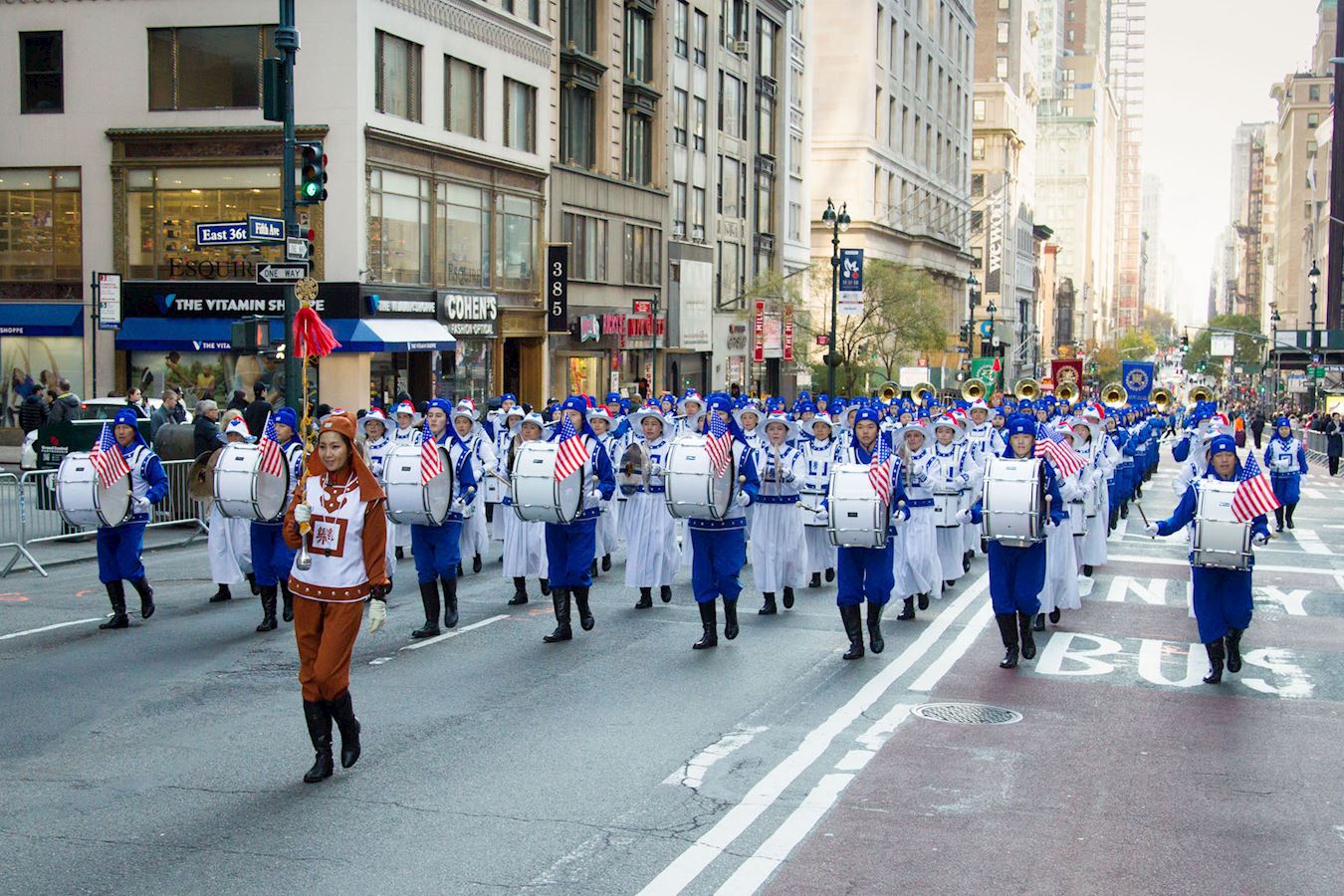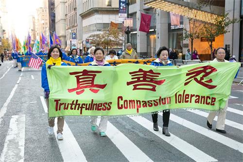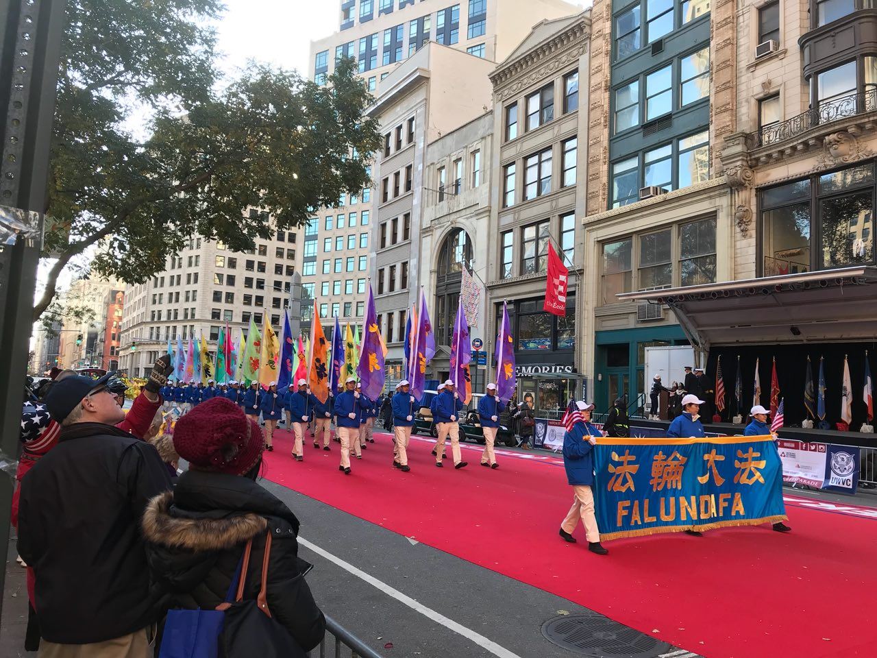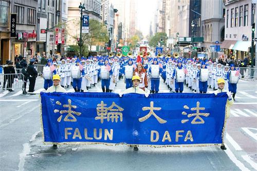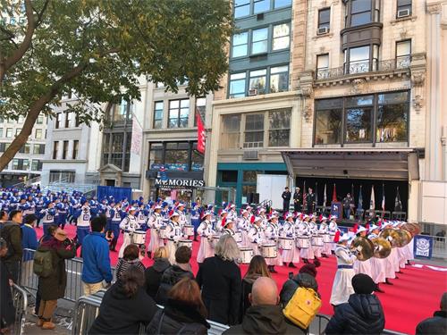 由法轮功学员组成的天国乐团、彩旗阵、莲花船队、功法演示队、腰鼓队等方阵,队伍整齐,精神抖擞,延绵几个街区。天国乐团亮丽的古式兵将服饰、雄壮的乐曲、威武的英姿,相当吸引观众,获得很多赞叹,民众纷纷掏出手机拍摄这个时刻。