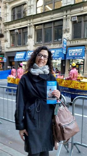 来自危地马拉的卡门(Carmen)久久地站在天国乐团的队伍前方录像、拍照留念,她按捺不住自己内心的喜悦,她还表示法轮大法好,要学炼法轮功。