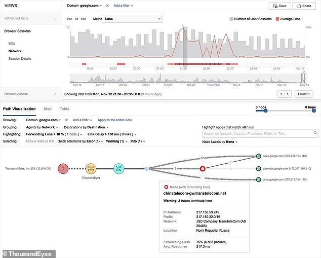 ![]() 图片3说明:此图显示来自旧金山的网络情报公司ThousandEyes的流量被通过中国转送 |