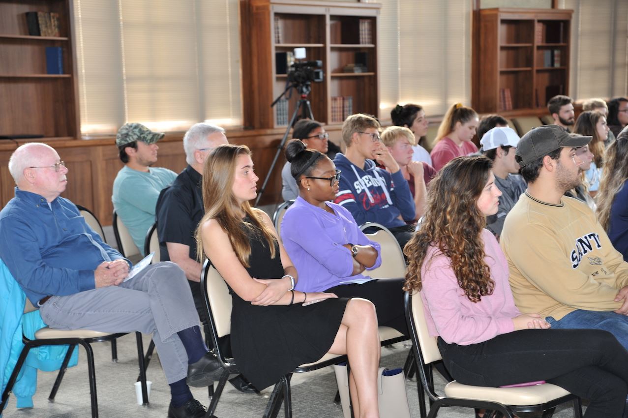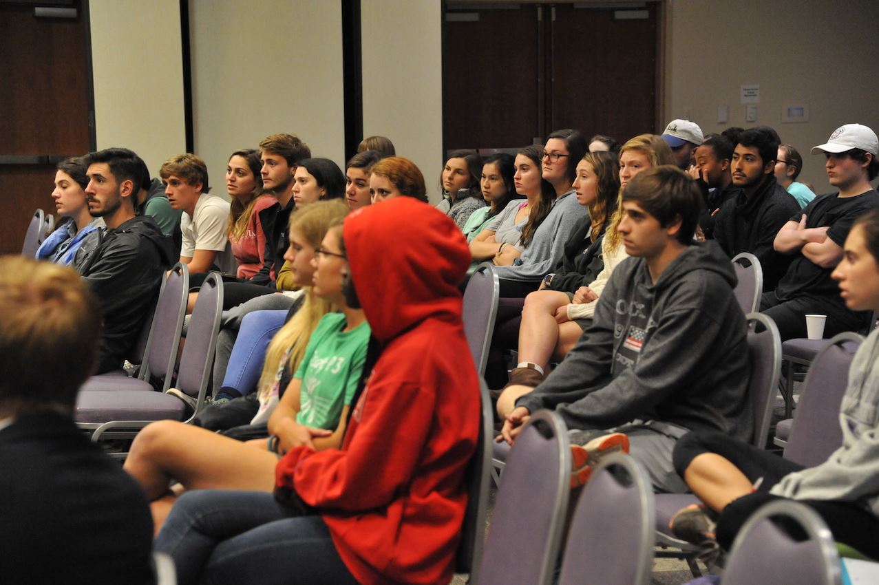 '图6:2018年10月26日,教职员工与学生在春山学院的伯尔尼纪念堂里聆听三位嘉宾关于发生在中国大陆活摘罪行的讲座。'