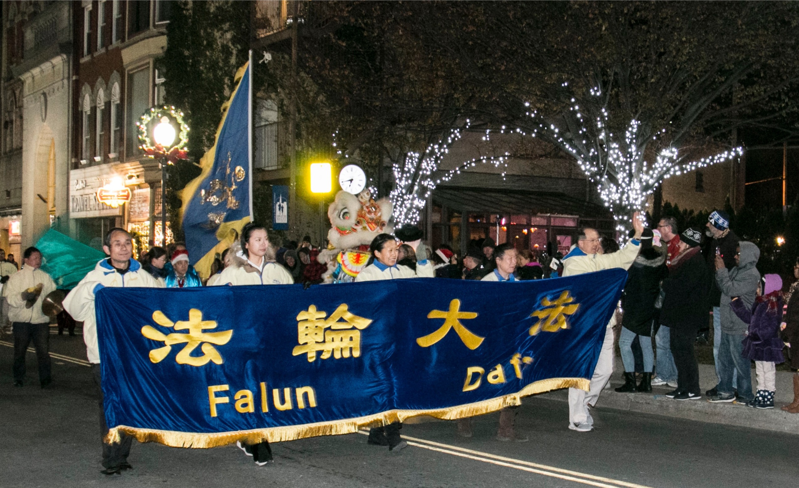 法轮功学员组成的方阵参加上州米德敦市(Middletown)圣诞点灯游行。