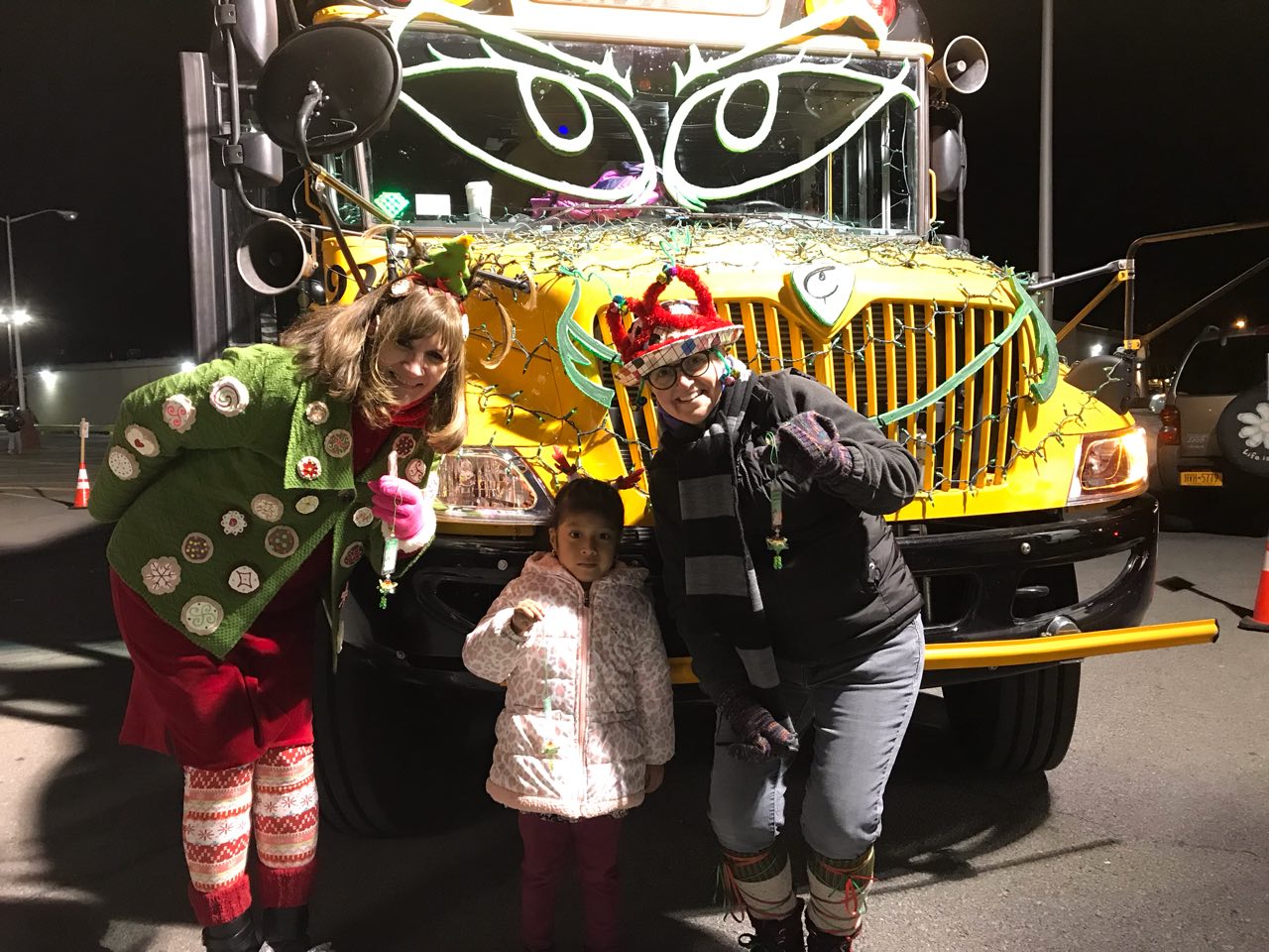 两位校车花车上的老师身着节日服装,手拿着法轮功学员赠与的中英文“法轮大法好”的小莲花和孩子们愉快地合影。