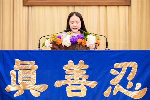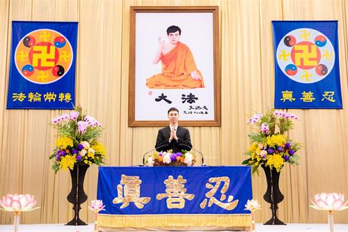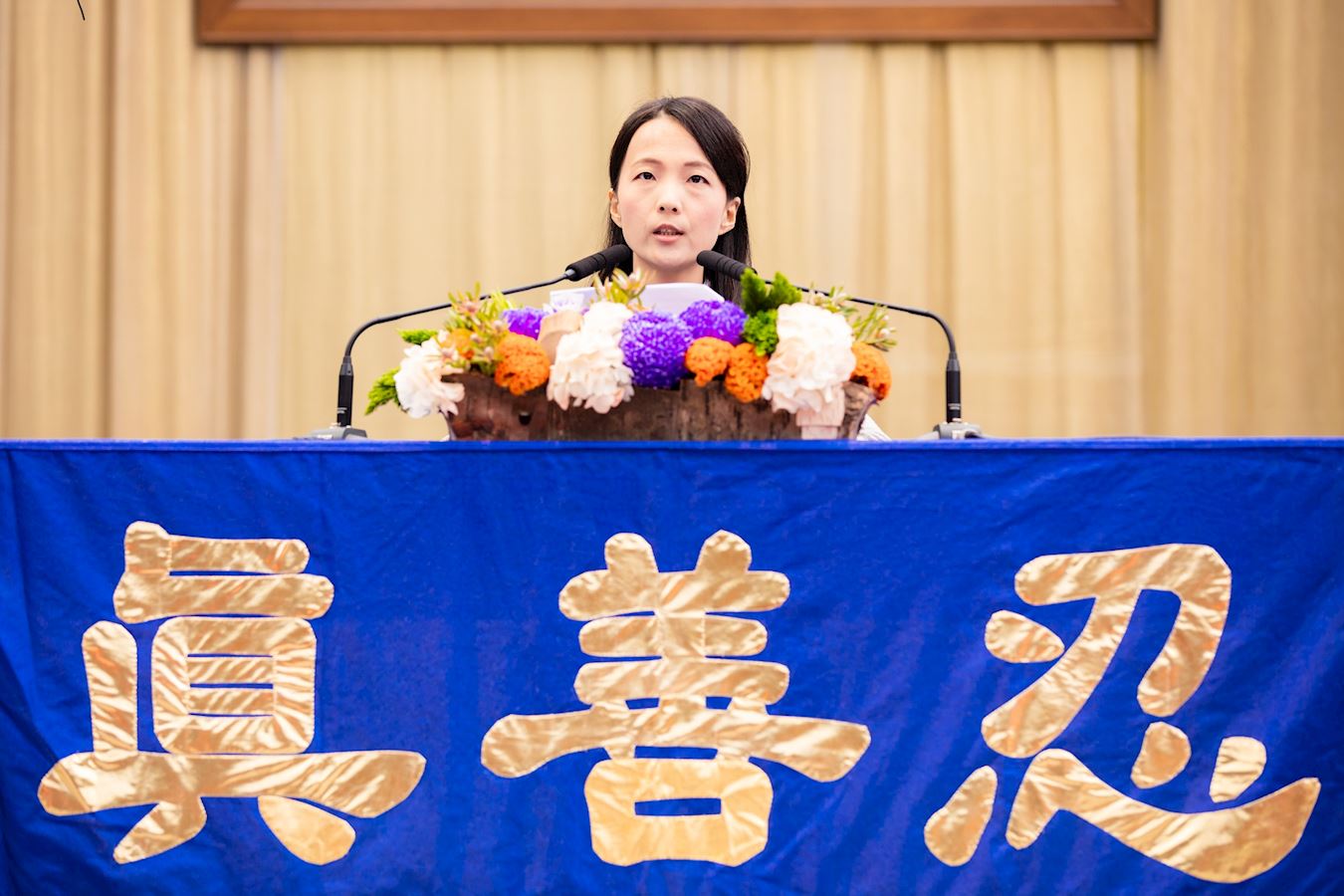 法会现场隆重庄严,师父的法像高挂中央,“真善忍”和“法轮常转”的法轮图形悬挂左右。长达数米的蓝底金字竖幅——“慈悲能溶天地春 正念可救世中人”[2]悬挂在主席台两侧,激励着所有同修。今年共有二十位学员发言,其中包括医师、大学教师、研究生、室内设计师、家庭主妇、银发族等各行各业,他们按照真、善、忍原则在修炼中实修自己、用心救人的体悟与感受,让在场人士深受鼓舞与触动。