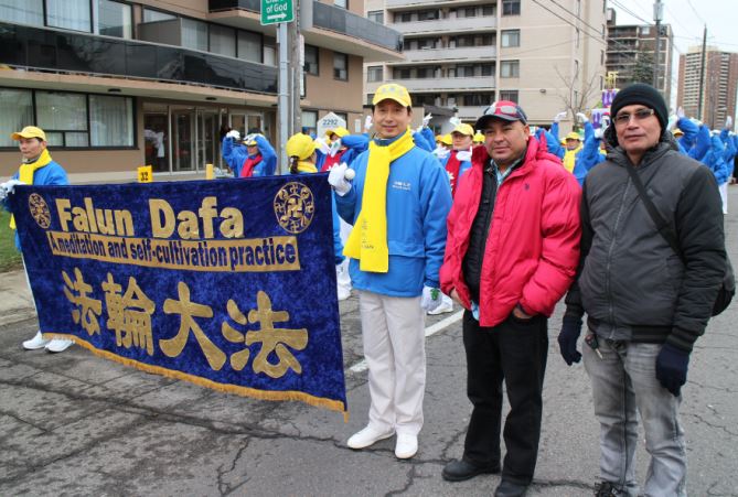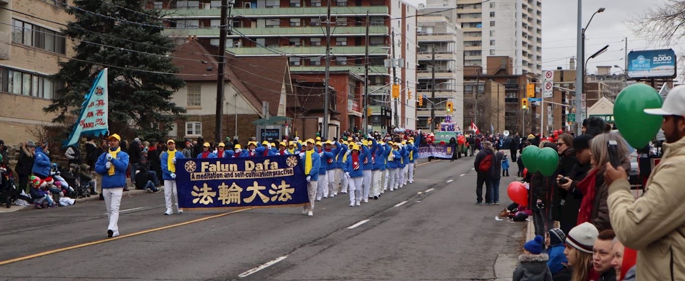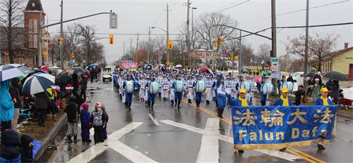 由法轮功学员组成的炼功队参加了多伦多市二十五日下午两点举行的圣诞游行,队伍沿着Weston Road 南行,终点在Sidney Belsey Crescent,全程2.1公里,他们的功法演示获得观众及组织者的赞誉。