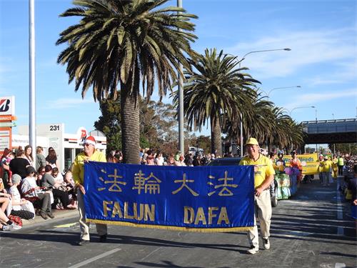今年的队伍以蓝底金字的法轮大法横幅打头,紧跟着是用莲花和祥云装饰的花船,花船上仙女仙童端坐金莲,演示法轮功打坐的功法,把善的祝福灑向世人。身着黄衫的法轮功学员们步履矫健,精神饱满,热情与观众互赠良好祝福。观众们频频鼓掌,挥手祝福,拍照录像。