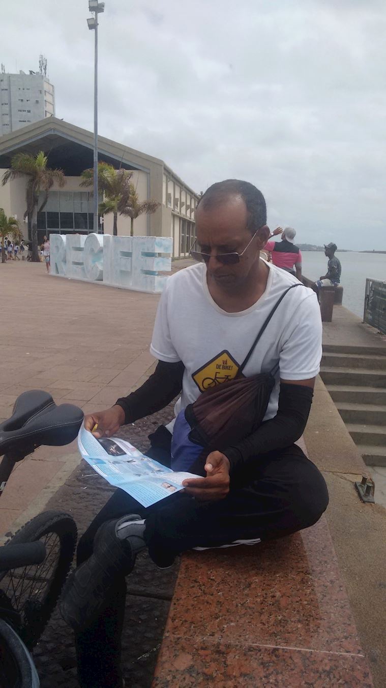 一个年轻店主正站在店门口,学员打完招呼征得同意后开始讲基本真相,他听了一会儿说:“你在这里讲这些是违法的,大使馆的人会来抓你的。”学员笑着说:“小伙子,世界各地都是讲法律的,在巴西信仰和言论是自由的,使馆的人也是要遵守的,就是在中国宪法上也写着信仰和宗教是自由的,言论是自由的。是江泽民出于嫉妒迫害法轮功,他才是真正的违法。中国公安部发布的红头文件指出的十四种邪教中没有法轮功的名字,法轮功是被江泽民诬陷的。天安门自焚是欺骗中国人的一个电影,栽赃给了法轮功。你认为如果不是事先安排好的,警察巡逻时会背着灭火器在天安门广场上走吗?”