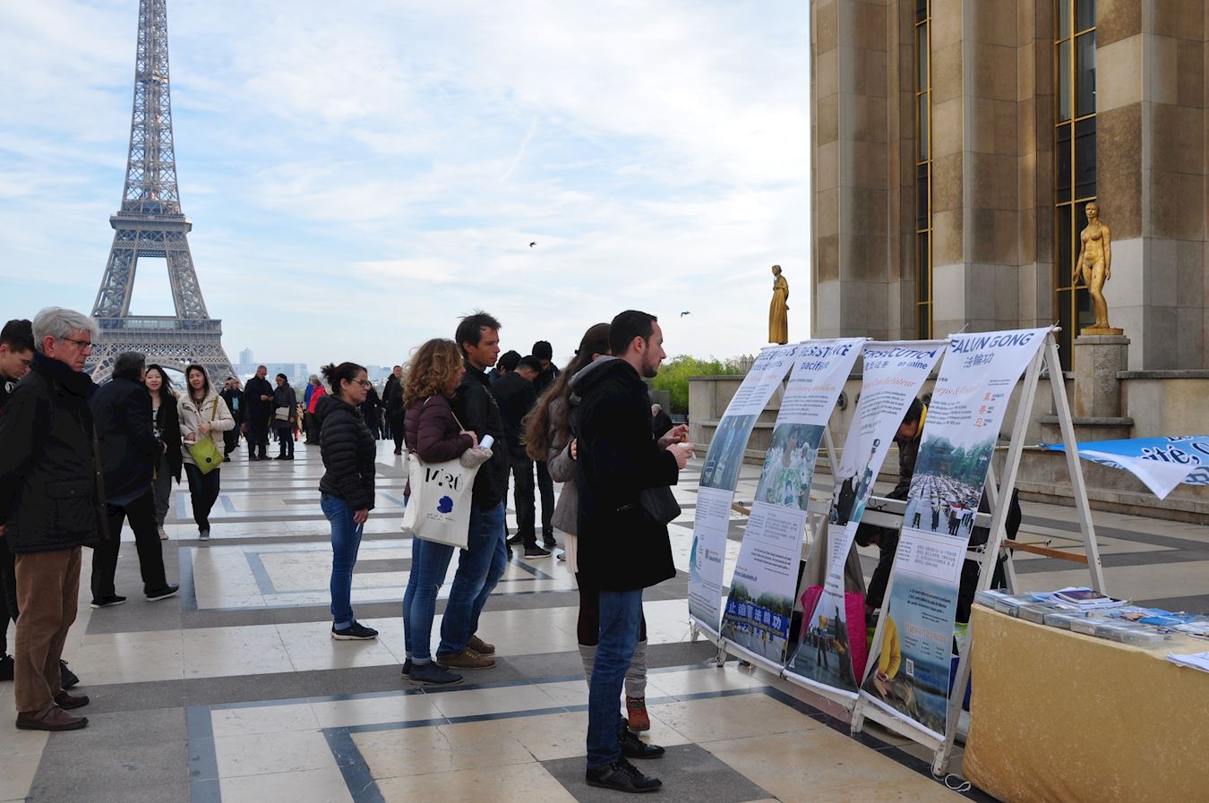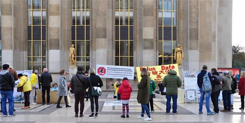 ![]() 图1~2:二零一八年十一月四日,法轮功学员冒着寒风在巴黎艾菲尔铁塔的人权广场上传播法轮功的真相。许多游人驻足了解真相。 |