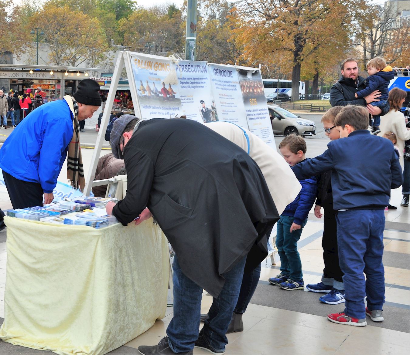帕斯卡尔(Pascal)先生是一位律师,今天他和在政府部门工作的太太及三个孩子经过人权广场时,认真地看完展板上的信息后,夫妇在征签表上签了名。帕斯卡尔先生说:“我们刚刚看过资讯,才知道法轮功被迫害,这真是令人沮丧,难过,我祝愿他们勇敢地坚持下去。”他的妻子说:“我们全力支持他们”。