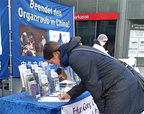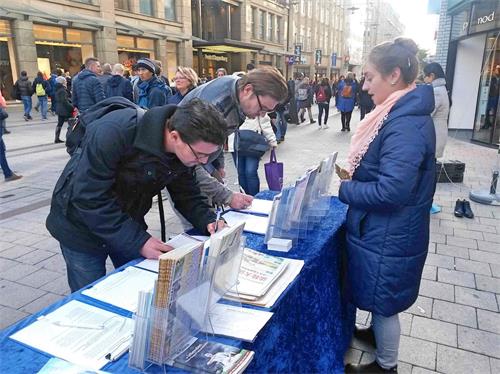 看着横幅上法轮功学员祥和的功法演示和中共血腥迫害的鲜明对比,娜迪亚(Nadja)和安德烈(Andre)径直来到签名台前。听完学员告诉中共为什么要迫害法轮功后,他们马上签名表示自己的支持。娜迪亚谈到:“(法轮大法)一定是很好的。”签名后她说:“我觉得这(签名)是有意义的,通过签名我也可以出一份力,而且我还可以让我的亲朋好友也来关注这一切。”安德烈坚信:“只有正义能战胜邪恶。我们必须同心协力,因为人多力量大,这很重要。”