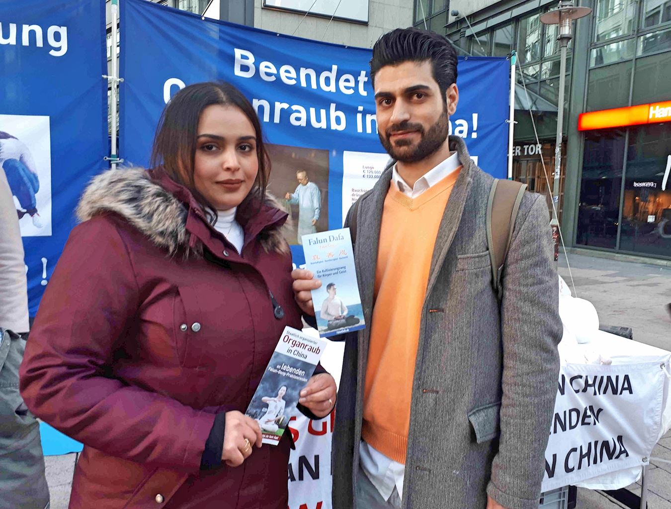 现在居住在汉堡的拉法埃达(Raffaeida)来自也门,她先生梅苏特(Mesut)来自伊拉克。在听到扬声器中播放的关于法轮功的真相后,他们驻足与法轮功学员交谈。他们谈到自己第一次听说对法轮功的迫害,特别是中共活摘的罪行。拉法埃达说:“这样的(罪行)不该发生。摘取器官,谋取利益并杀戮——这不该被容许发生!”她先生梅苏特也是同样的想法,他们签名支持法轮功学员。